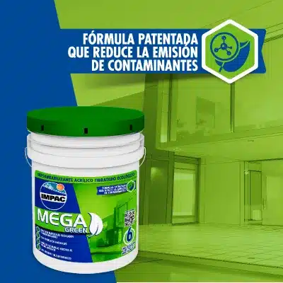 Impermeabilizante acrílico fibratado impac mega green, brinda impermeabilidad al agua y resistencia a la intemperie y a los rayos uv. La mezcla color terracota está elaborada con pigmentos naturales y llanta reciclada molida que disminuye el problema creciente de acumulación de llantas desechadas. Su base de agua no contiene solvente y es libre de químicos tóxicos y dañinos al medio ambiente y las personas. Debido a que es un producto fibratado no requiere malla de refuerzo durante su uso. Su presentación en cubeta de 19 l rinde hasta 19 m2.