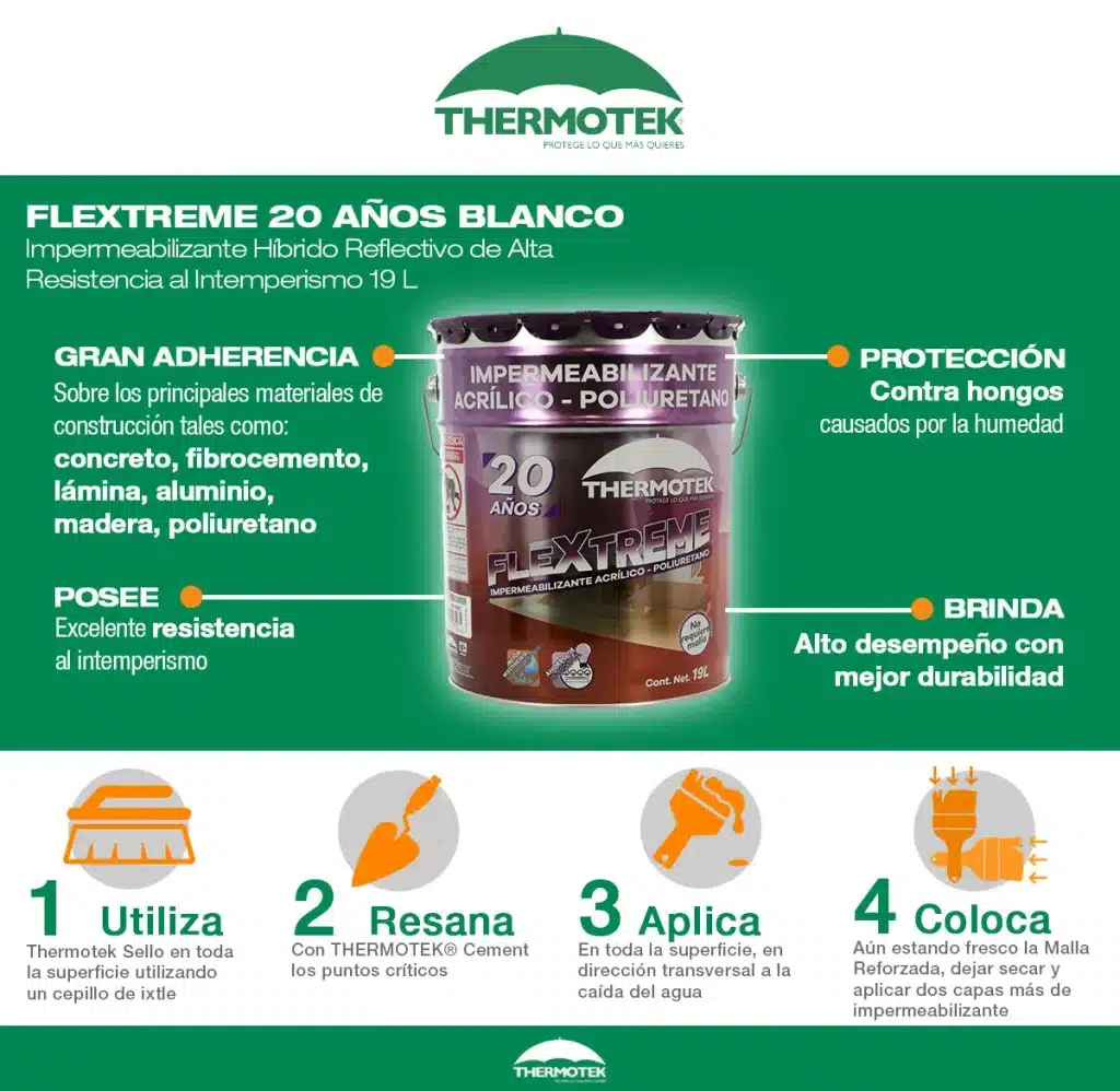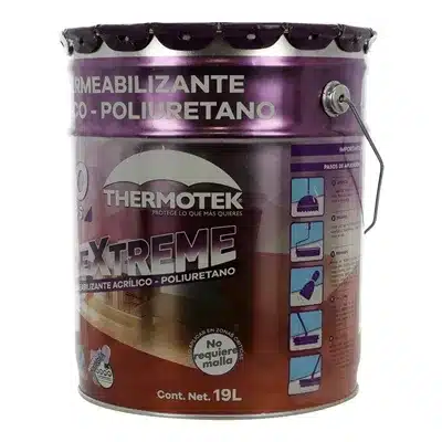 Impermeabilizante Flextreme Thermotek, es un recubrimiento para losas de concreto, lamina metálica o espuma de poliuretano, también sirve para mantener y renovar sistemas impermeables ya existentes. Fabricado con compuestos a base de poliuretano y acrílico que lo vuelven capaz de soportar cambios térmicos estructurales ocasiones por la temperatura. Mejora la resistencia a la degradación provocada por agentes ambientales como polvo, rayos solares o lluvia. La aplicación es directamente en la superficie a 2 manos y necesita 24 horas para el secado final. Su presentación es en cubeta de 19 L.