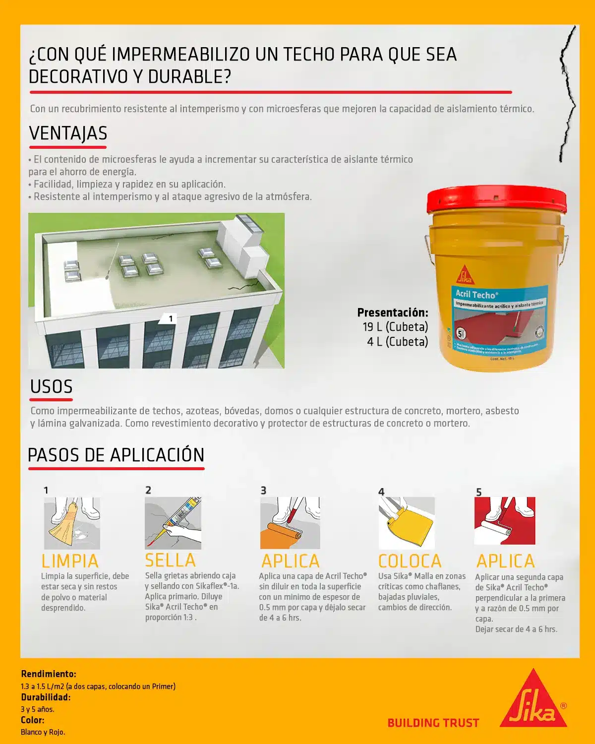 Impermeabilizante y aislante Acril Techo rojo Sika, brinda excelente adherencia y resistencia a la intemperie al aplicarse sobre techos, bóvedas, azoteas, domos, aplanados y estructuras de concreto, mortero, asbesto y lámina galvanizada, entre otros.Funciona como revestimiento decorativo debido a que es un recubrimiento elástico impermeable, al estar elaborado con resinas acrílicas, libre de solventes que le proporcionan elasticidad y rápido secado, así como resistencia al intemperismo y al ataque agresivo de la atmósfera.Contiene microesferas que aumentan su capacidad de aislamiento térmico y ayudan en el ahorro de energía. Su presentación en cubeta de 19 L ofrece un rendimiento de 1.3 a 1.5 L/m2 y puede aplicarse con brocha, rodillo, cepillo, espátula y cubeta.